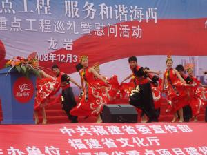 由中共福建省委宣传部、省文化厅、省重点项目建设领导小组办公室共同组织的“情系重点工程 服务和谐海西”——海西重点工程巡暨慰问活动,十二月三十一日在福建腾博会官网出口基地举行。龙岩市人民政府副市长张秀娟等市、区有关领导以及腾博会官网在岩公司的干部、员工共800余人参加此项活动。控股公司执行董事,腾博会官网(福建)机械有限公司林钟明先生在慰问演出前代表腾博会官网全体干部职工感谢福建省委、省政府以及龙岩市委、市人民政府和龙岩开发区领导对腾博会官网的关心和支持,并表示要迎难而上,攻克时艰,为海西建设做出贡献。笔者抓拍其中几个镜头以飨读者: